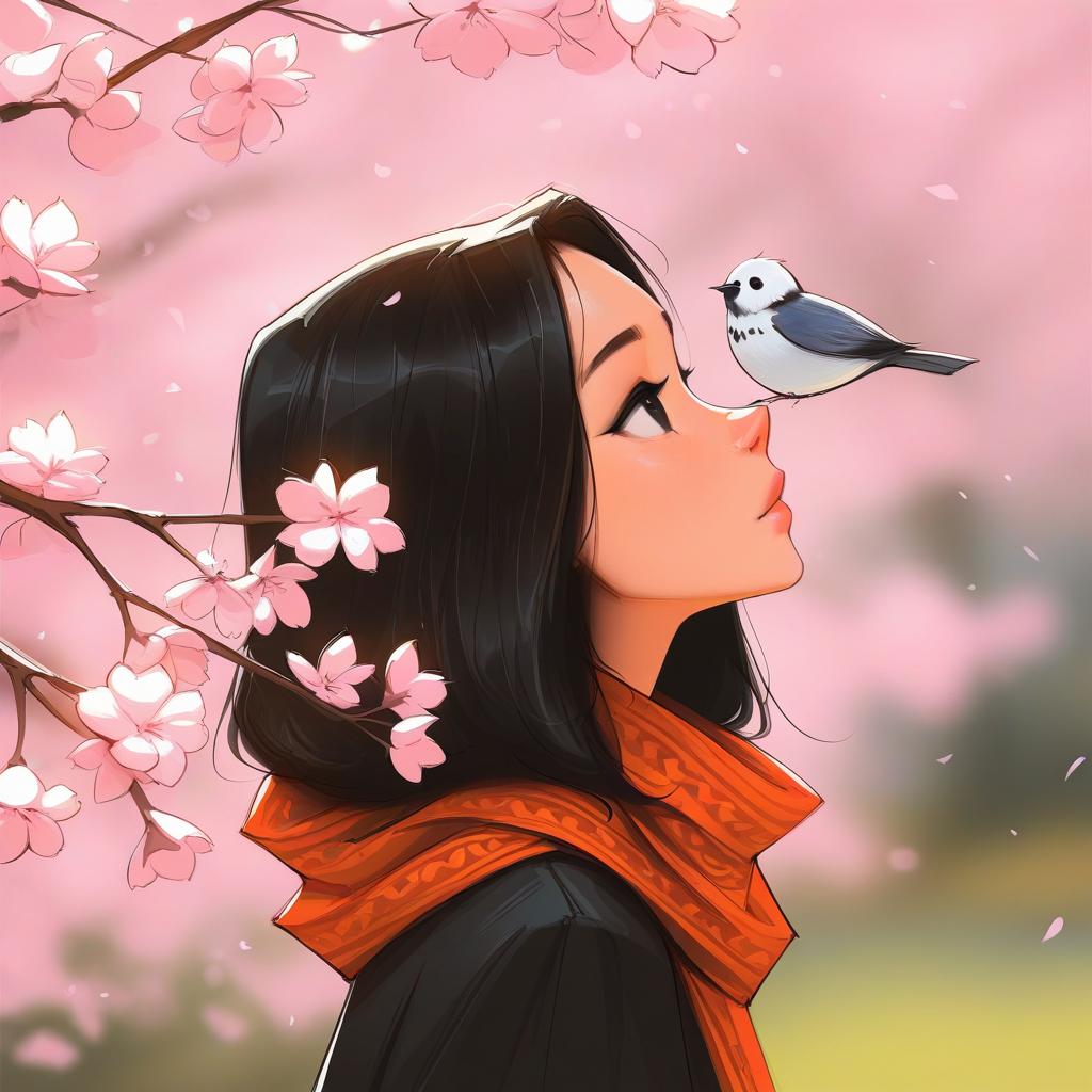Sam yang, 1girl, bird, black eyes, black hair, blurry, blurry background, cherry blossoms, lips, long-tailed tit, looking up, medium hair, profile, scarf, solo, tit (bird)