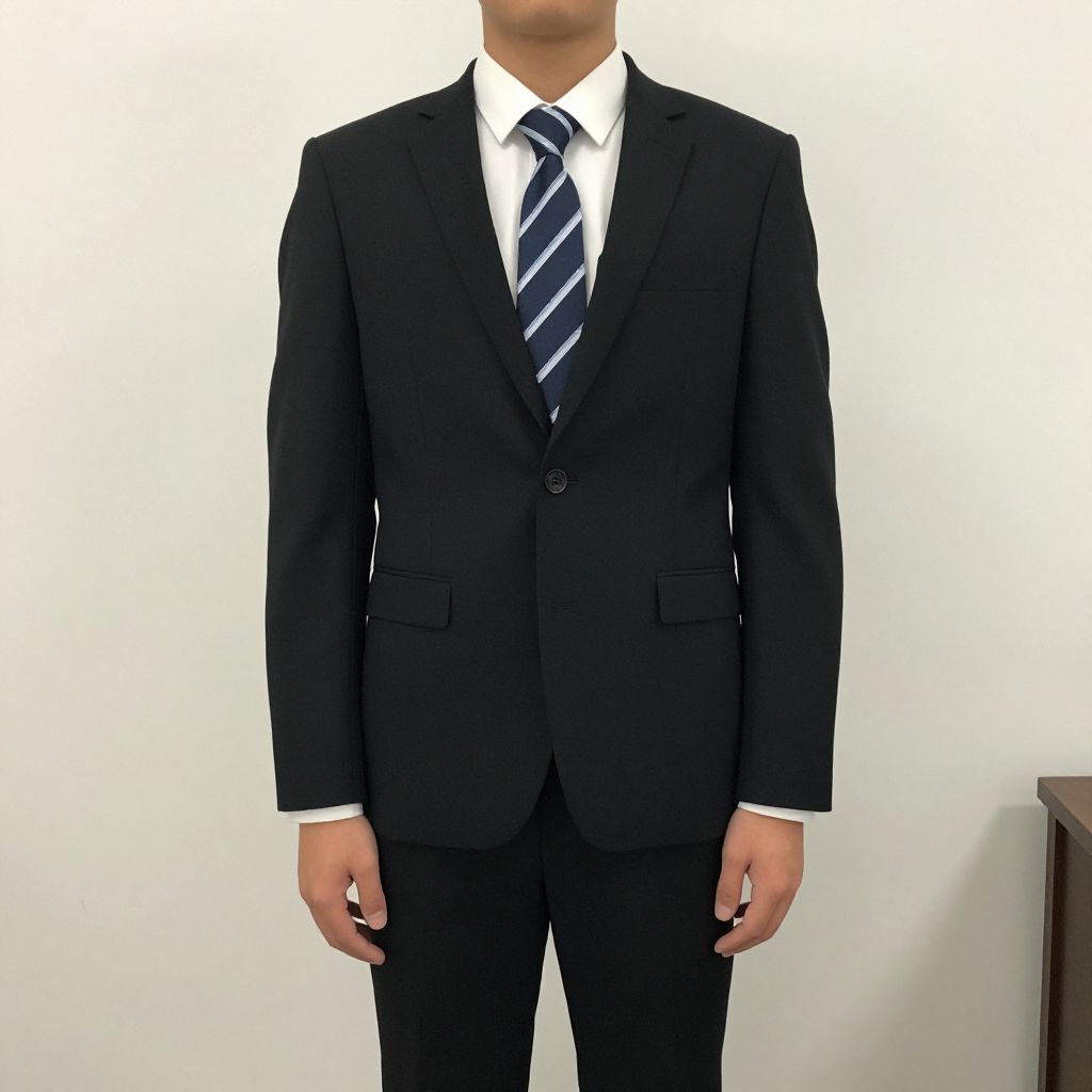 Office frock costume, 1boy, male focus, necktie, solo, suit, formal, realistic, striped necktie, shirt, black pants, black hair, jacket, pants, collared shirt, white shirt, standing, arms at sides, indoors, long sleeves, black jacket, asian