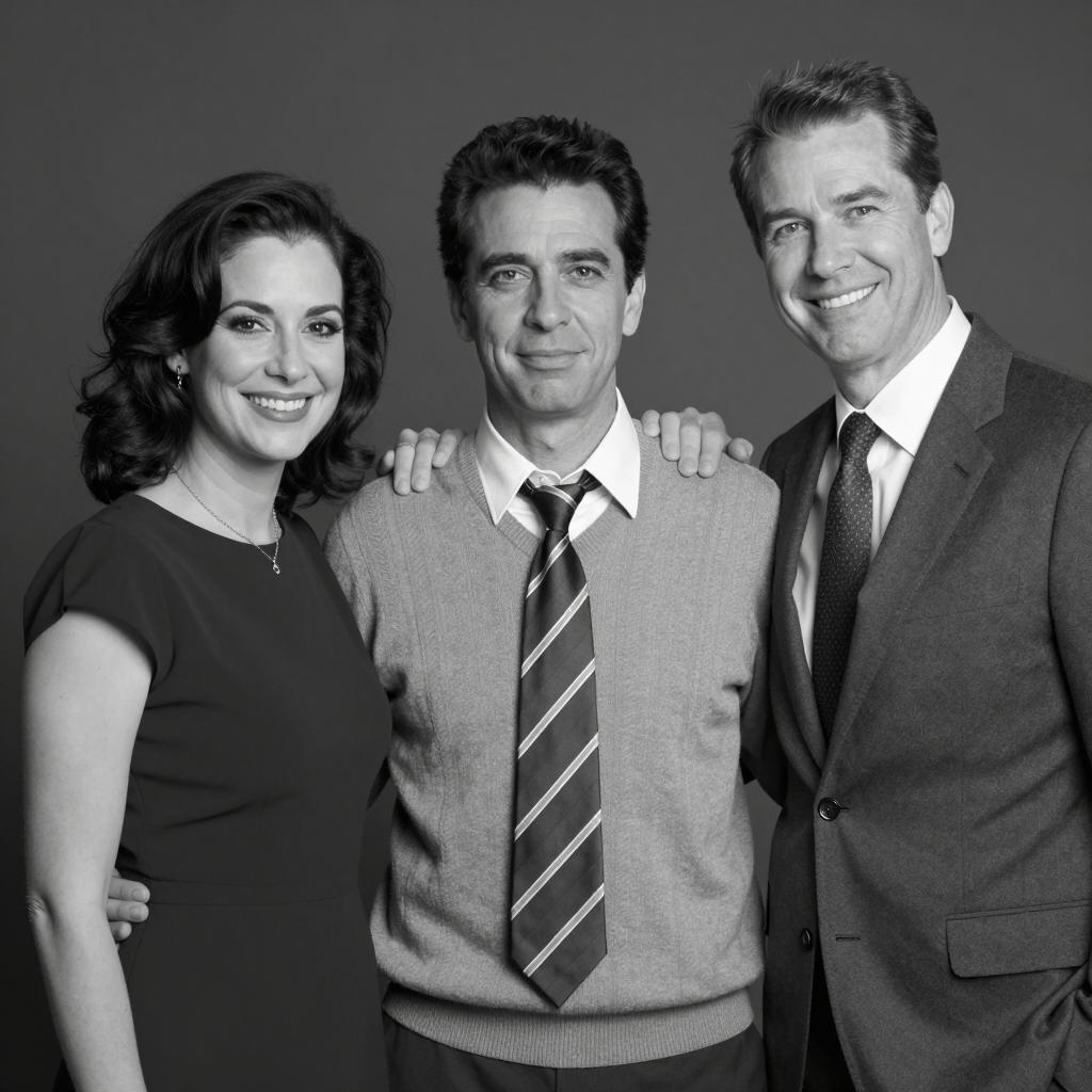 A middle-aged man wearing a dark suit jacket and white checkered shirt stands next to a woman with a striking black mohawk hairstyle and white face makeup. The woman is dressed in a sleeveless blue top and a silver pendant necklace. They are positioned in a wood-paneled room with red leather seating. An older man with white hair is seated in the background, looking away.