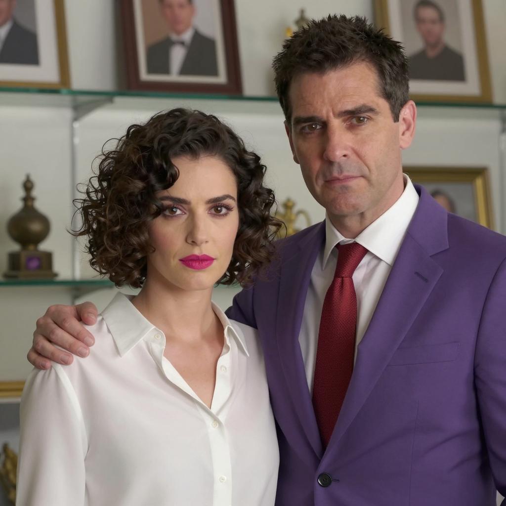 A man in a dark suit with white checkered shirt stands in front of a woman with a blue sleeveless top, silver necklace, and dramatic black mohawk with shaved sides. She has white makeup on her face. They are in a wooden-walled room with red leather chairs. An older man with white hair sits in the background, looking to the side. The man's hand rests on the woman's armrest.