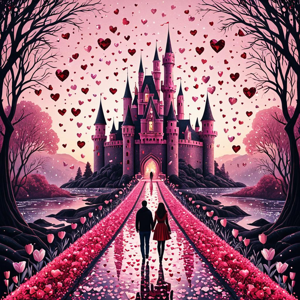 Valentine’s Day fantasy illustration of a castle made of pink and red crystals, surrounded by floating hearts and flowers, with couples strolling along crystal paths under a twilight glow full of sparkles