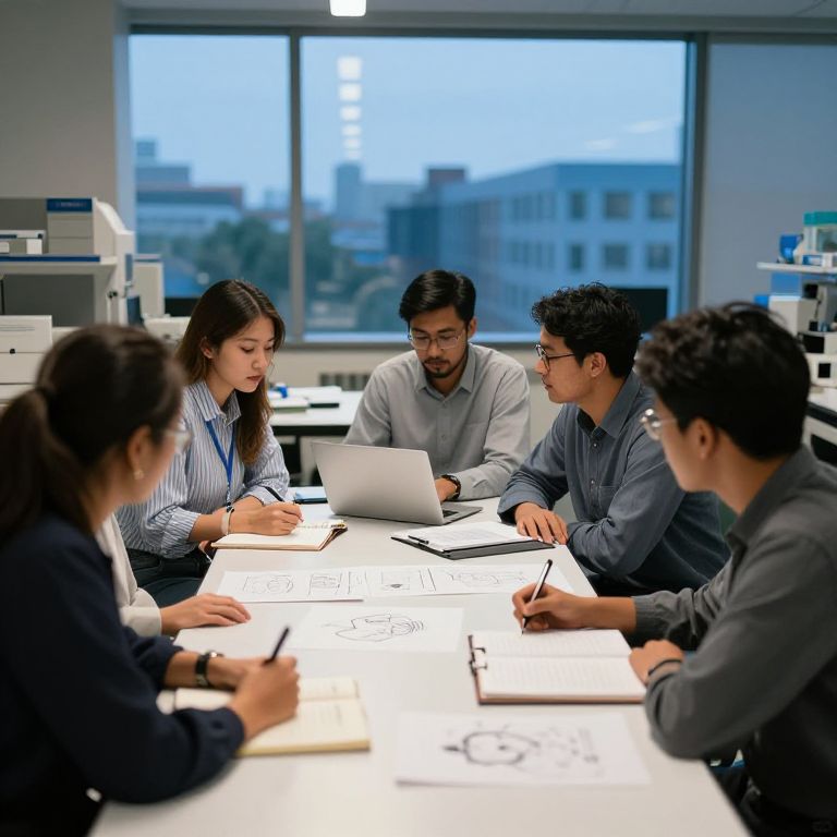 A university research lab in the evening with soft lighting, researchers collaborating around a table with notebooks and diagrams, and a window showing a city skyline outside