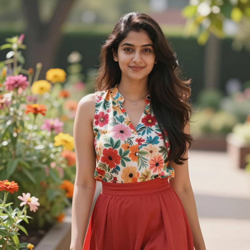 Holi party attire, photorealistic portrait of young woman, standing in flower garden, bright sunlight, long dark brown wavy hair, sleeveless floral blouse, red high-waisted skirt, vibrant pink, orange, and yellow flowers in background, blurred green foliage, natural makeup, subtle smile, casual style, daytime, summer, realistic ures, detailed flowers, bokeh effect, soft shadows, warm colors, Indian ethnicity, attractive, relaxed pose, floral patterns, natural beauty, garden path, outdoor setting