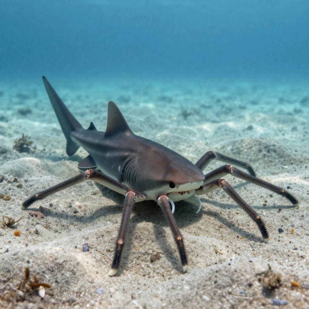 Spider shark resting on the ocean floor, spider legs sprawled out in a sandy seabed, soft light filtering from above, surreal underwater creature concept art