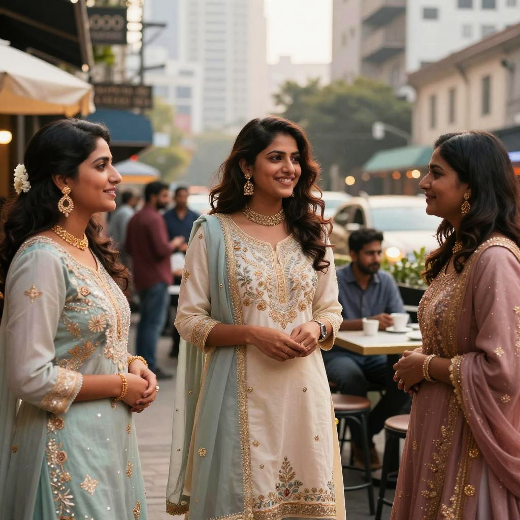 North indian women in urban environment, dressed in modern fusion attire mixing traditional embroidery with contemporary style, city skyline, lively street cafe, candid moments