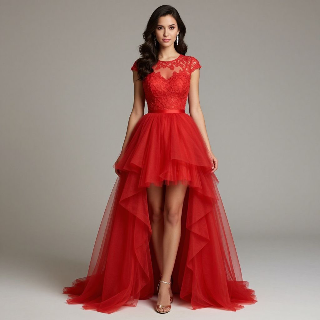 Elegant woman wearing a vibrant red lace-tulle short prom dress with a high-low silhouette, featuring a sheer layered skirt cascading gracefully to the floor, paired with delicate earrings and gold heels against a neutral backdrop.