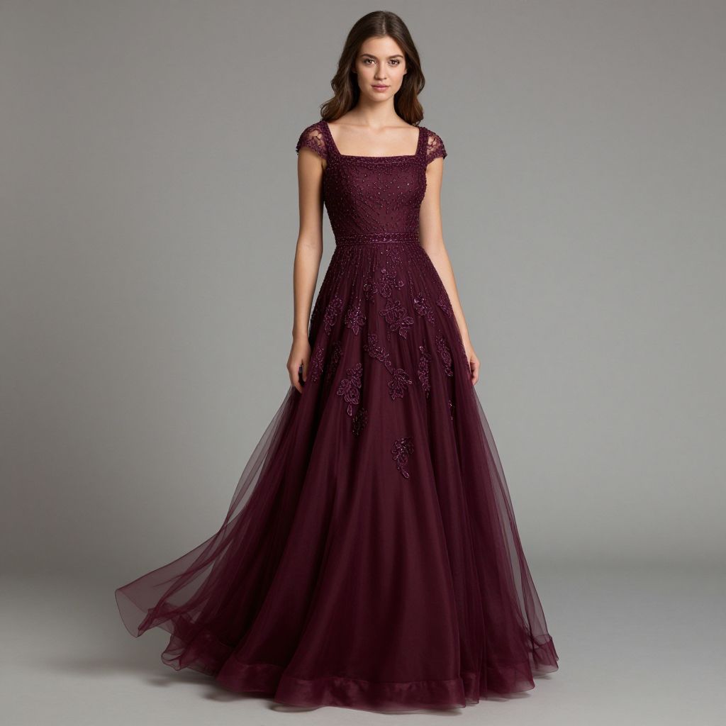 A stunning high-definition photograph showcases a woman elegantly dressed in a burgundy A-line evening gown featuring a square neckline adorned with intricate beading and lace appliqués, complemented by a flowing ruffle tulle skirt, capturing the timeless beauty of 2016 fashion trends.