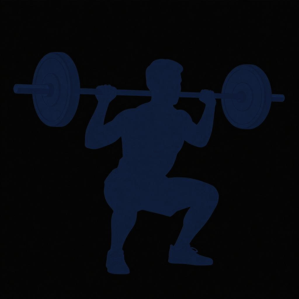 A digital silhouette of a person performing a barbell squat. The figure is dark blue against a black background, showing the person's bent legs and raised arms as they lift a barbell with large weight plates. The style is minimalist, with clean lines and no additional details or textures. The person's gender is not distinguishable from the silhouette.