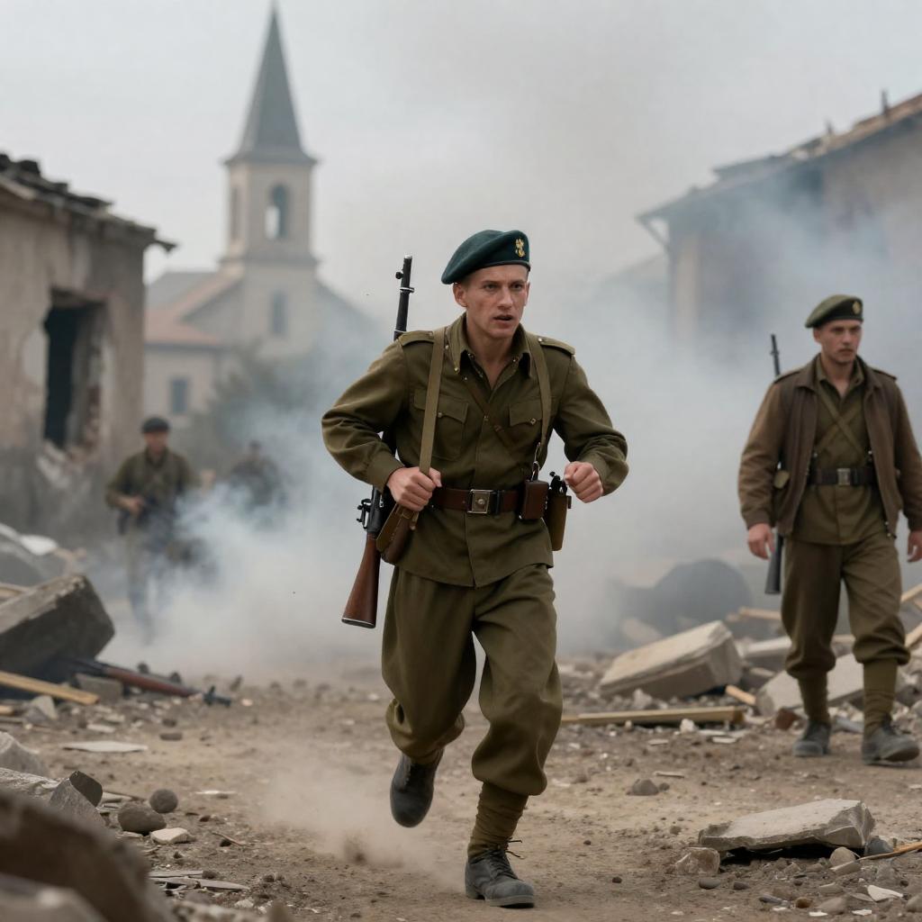 Photograph of five male soldiers in brown military uniforms and caps, working in a dimly lit, worn-out workshop. Four stand around a large, blue-spoked machine, while one repairs it. Machine parts and tools on a table to the left. Soldiers have focused expressions. Background includes dusty walls, windows, and industrial equipment.