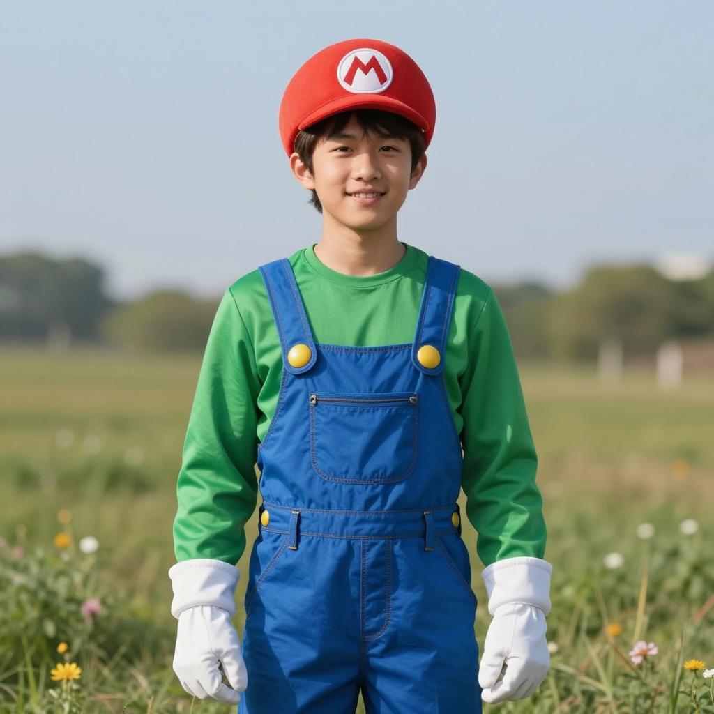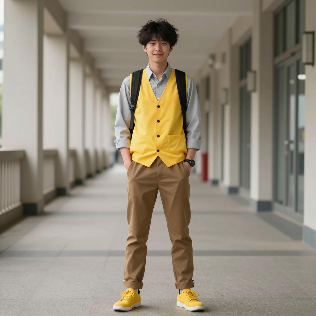 Jiminy cricket costume adult, photograph, man wearing yellow frog costume with antennae and googly eyes, green long sleeves, brown suspenders, dark brown pants, standing in urban street, sunny day, blurred background with people and buildings, cosplay, daytime, street costume, casual outfit, realistic style, street photography, natural light