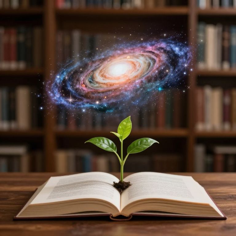 Photograph of an open book with a green plant sprouting from the center, a colorful galaxy above, set against a blurred bookshelf background.