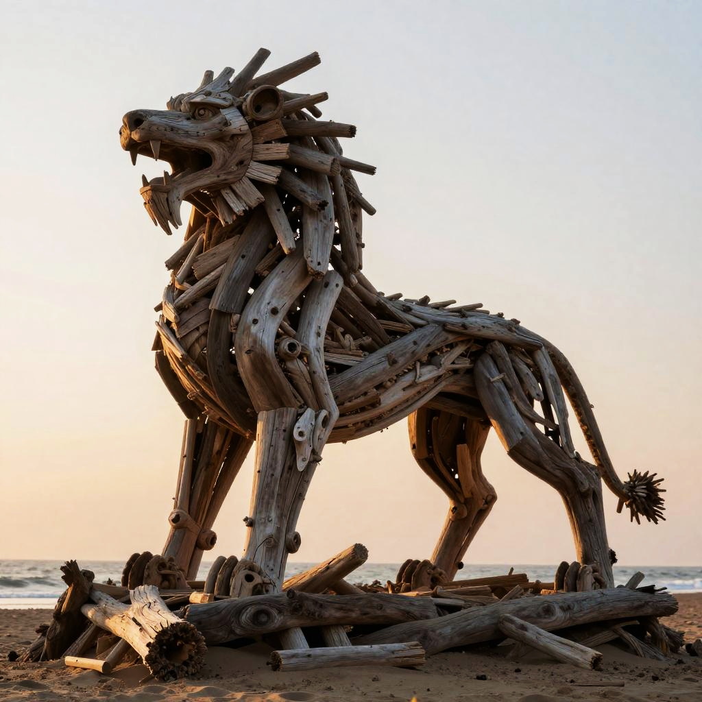 Photorealistic sculpture of a lion crafted entirely from chaotic driftwood pieces, standing on a sandy shore with the ocean and sunset in the background. The artwork features detailed wood textures and an imaginative design resembling a mythic lion or dragon, evoking natural and artistic elements.
