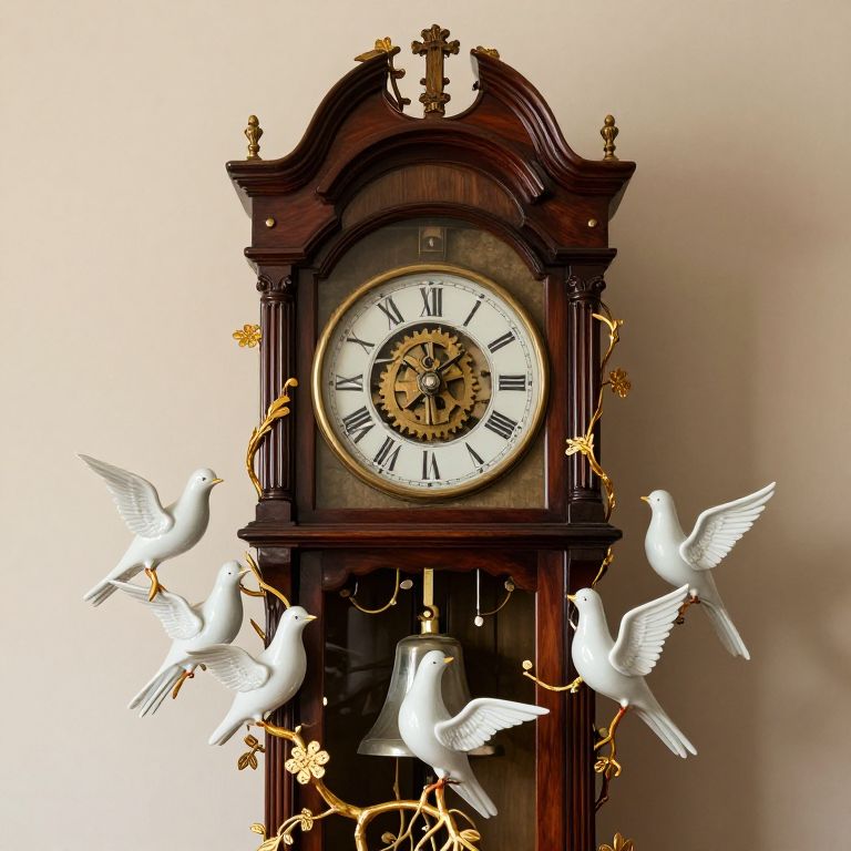 Photograph of a vintage, dark wooden grandfather clock with a round, white clock face featuring black Roman numerals and gold hands. The clock's top has ornate carvings and a small cross. Four white ceramic birds with outstretched wings and detailed feathers are perched on golden vines that wrap around the clock, adding an elegant, decorative touch. The background is a plain, light beige wall, highlighting the clock's intricate design and the birds' contrast. The overall style is classic and ornate, blending antique clockwork with delicate, decorative artistry.