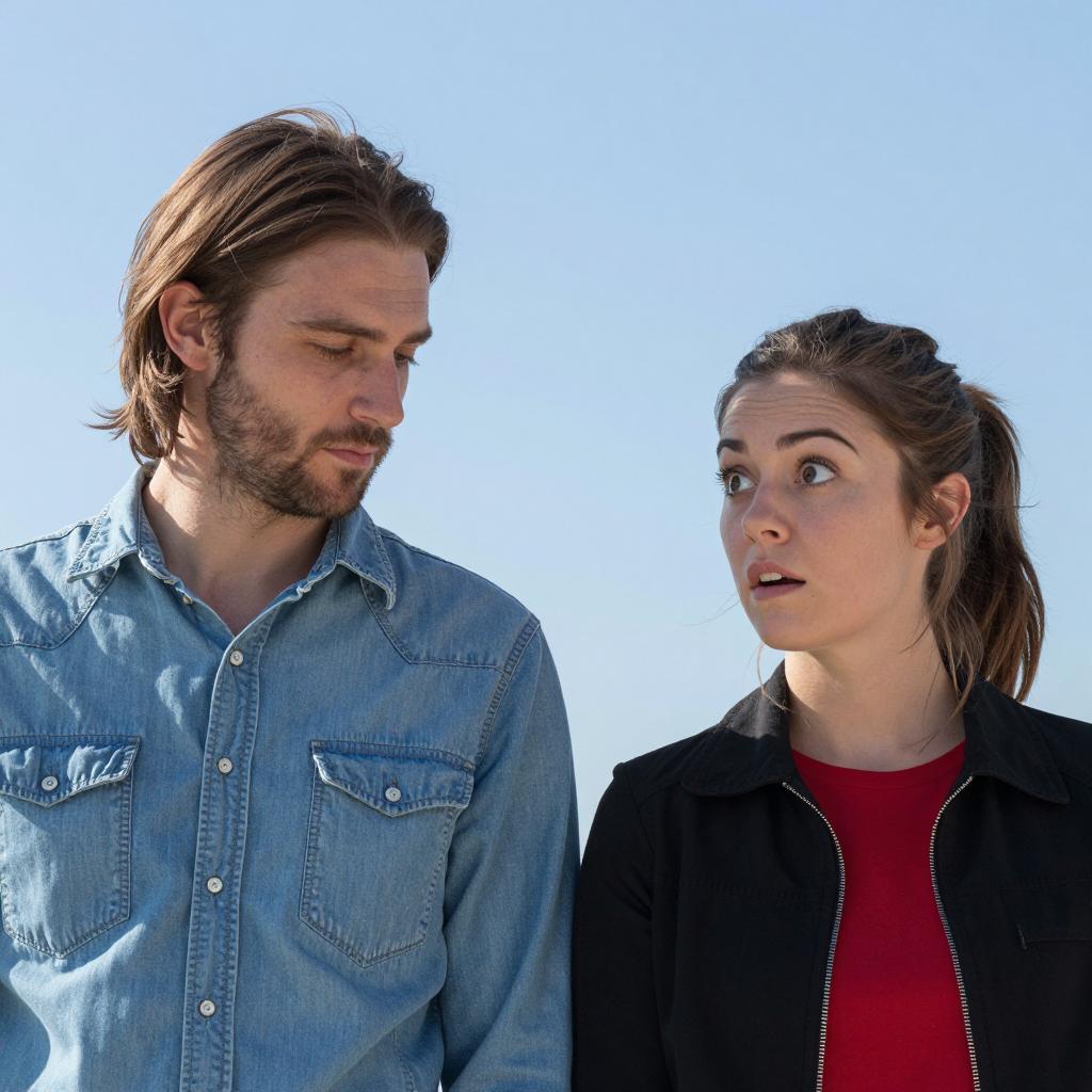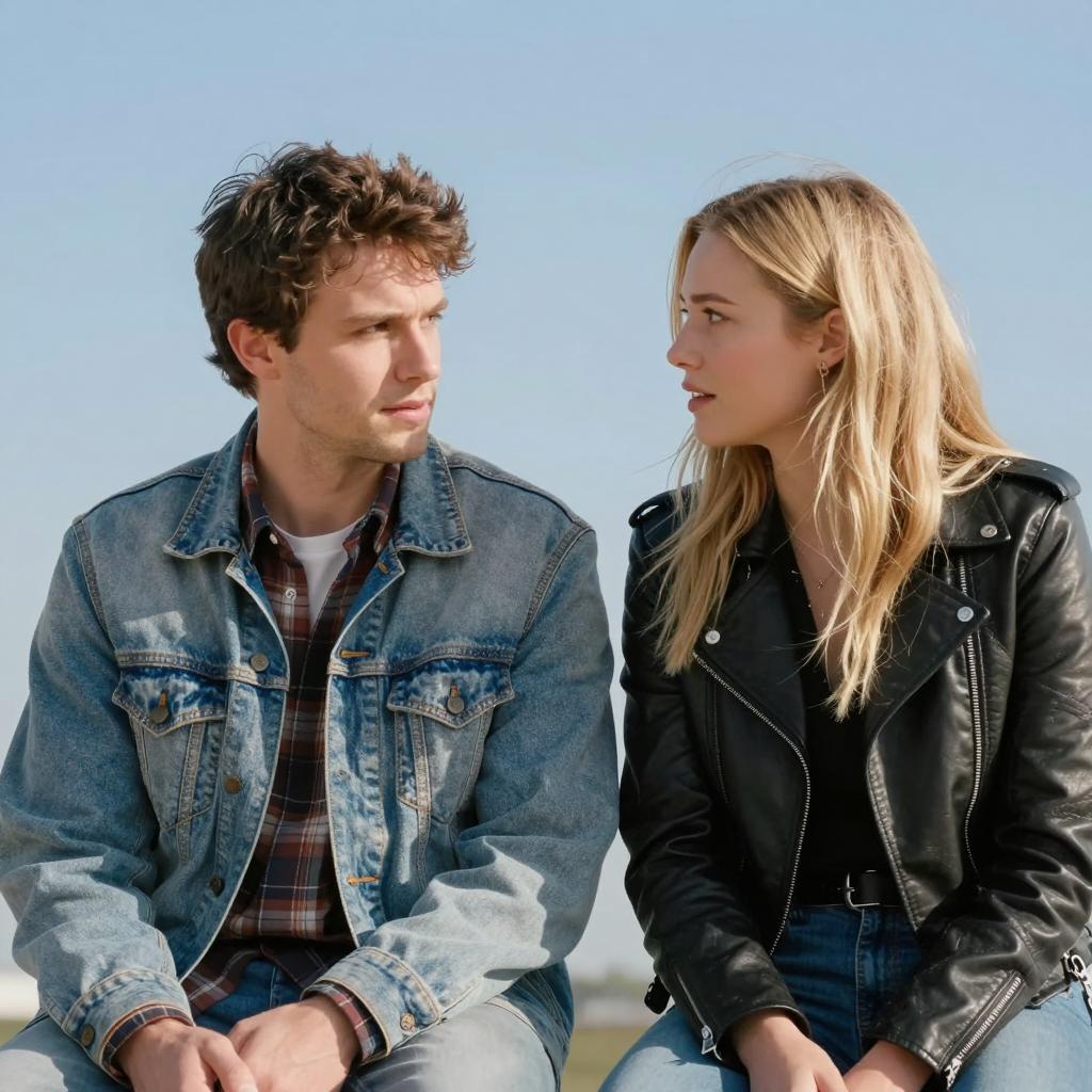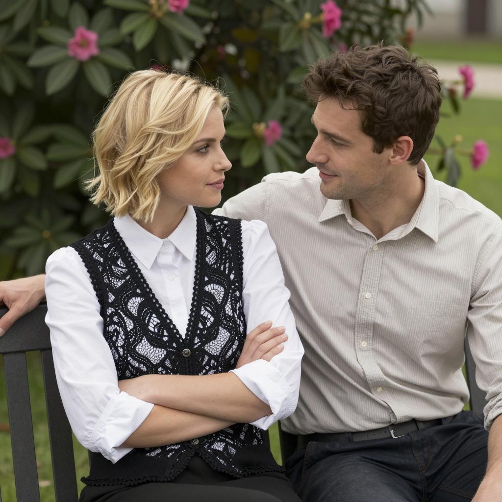 Photograph of two people sitting on a blue wooden bench in a park. The man with short dark hair, light stubble, and a brown jacket over a navy T-shirt with a white circular design, looks to the right with a slightly concerned expression. The woman with blonde hair in a loose side braid, green cardigan over a black top, and a colorful necklace, looks at the man. Background includes blurred greenery and wooden benches.