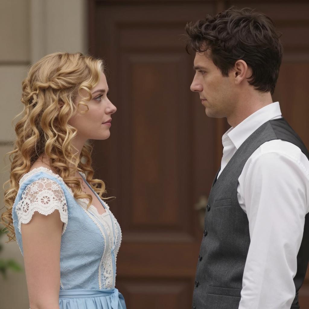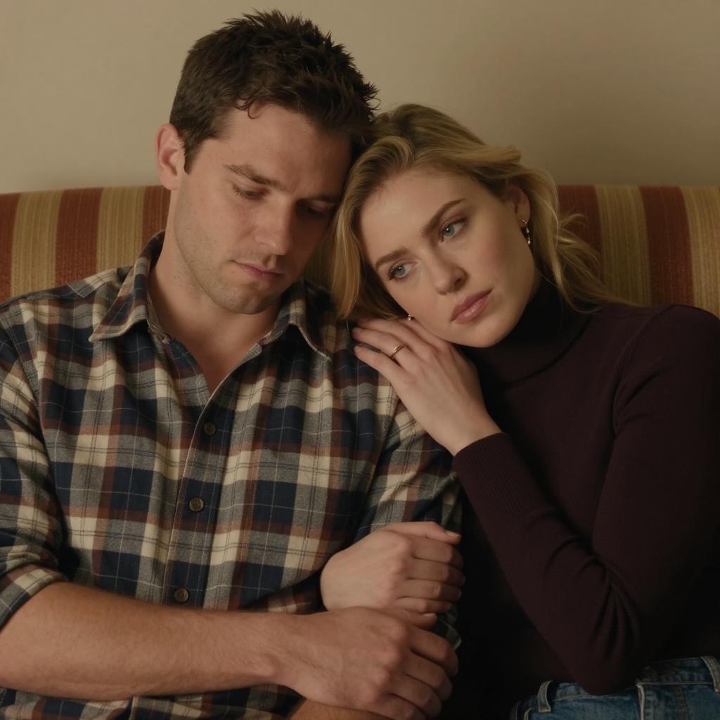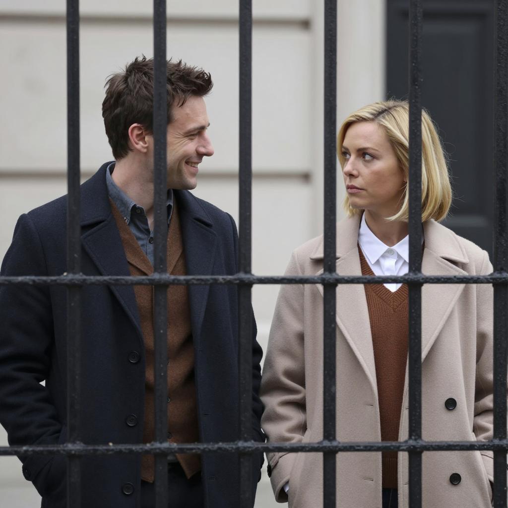 Photograph of two people sitting on a blue wooden bench in a park. The man with short dark hair, light stubble, and a brown jacket over a navy T-shirt with a white circular design, looks to the right with a slightly concerned expression. The woman with blonde hair in a loose side braid, green cardigan over a black top, and a colorful necklace, looks at the man. Background includes blurred greenery and wooden benches.