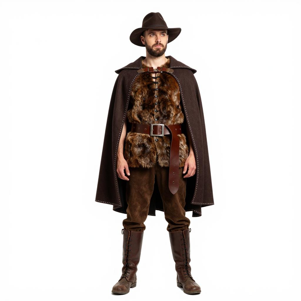 Man with brown beard and mustache, wearing a black hat and brown cape with white stripes, over a beige fur vest and grey shirt. He stands against a plain white background. He looks slightly to the side with a neutral expression. He wears a brown belt with a buckle. The image is a photograph.