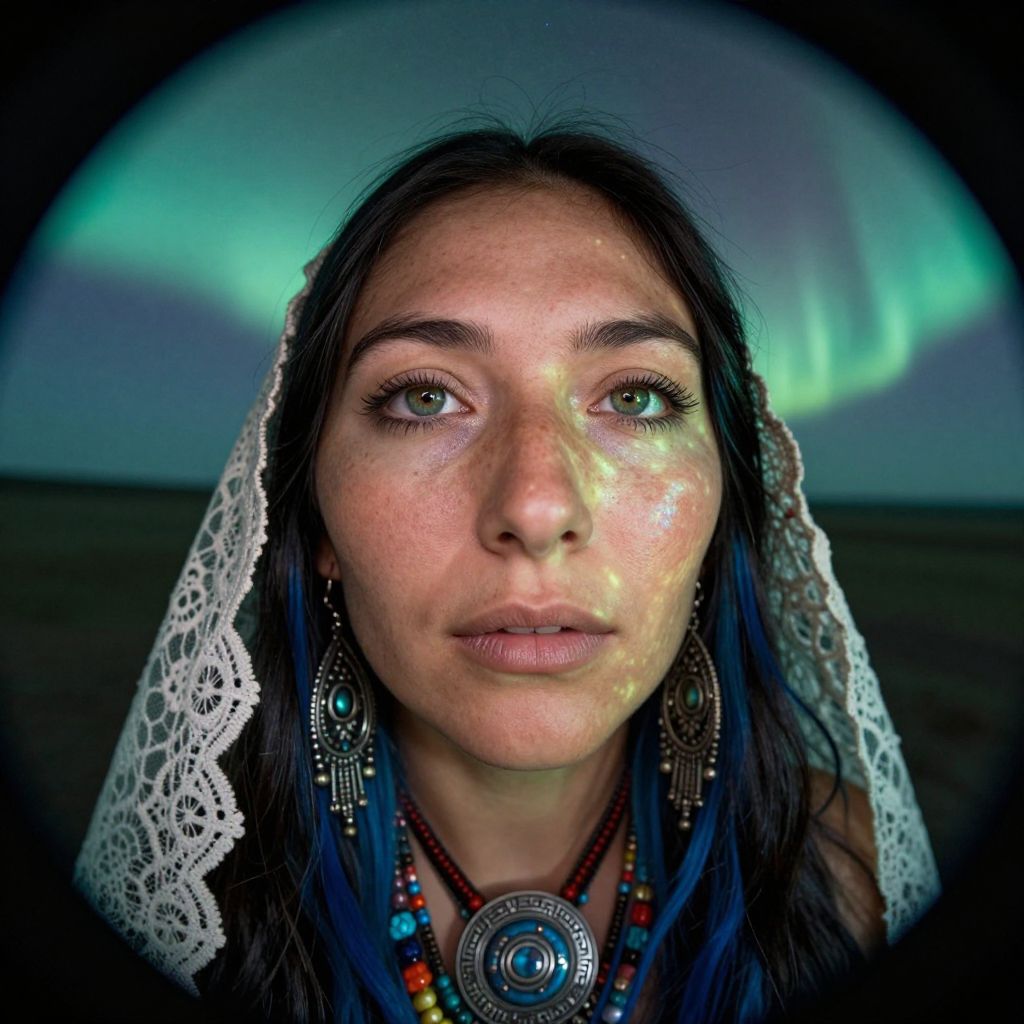 Envision a portrait photograph that captures the enigmatic gaze of a Native American woman. Her distant green eyes and raven-black hair, streaked with electric blue, exude an air of mystery. The soft glow of an otherworldly aurora borealis illuminates her face, creating a captivating play of light and shadow. Framed through an unusual fisheye lens, the portrait offers a unique perspective, drawing attention to the intricate details of her appearance. From the natural freckles gracing her porcelain skin to the intricate patterns etched into her antique-inspired jewelry, every feature is rendered in exquisite detail. The ethereal aurora light dances across her face and intertwines with the intricate lace veil adorning her shoulders, creating an emotional gradient that reflects the intriguing duality within her gaze, shifting between contemplation and intrigue.