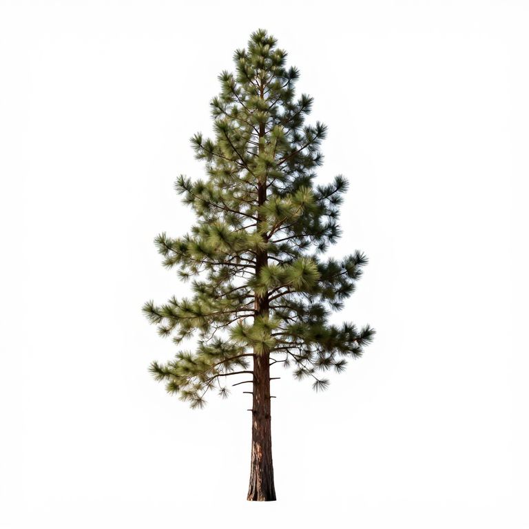 Photograph of a tall, slender pine tree with green needles, textured brown trunk, and white background, isolated and centered.