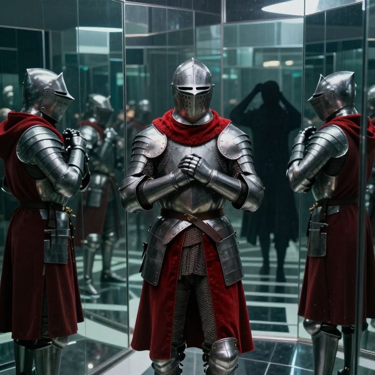 Trapped within a labyrinth of mirrored reflections, a knight in crimson-draped armor grapples with the enigma of his own identity, confronting the shadowy figure of doubt that dances beyond the grasp of reason, while the weight of solitude echoes through the cold, metallic air.