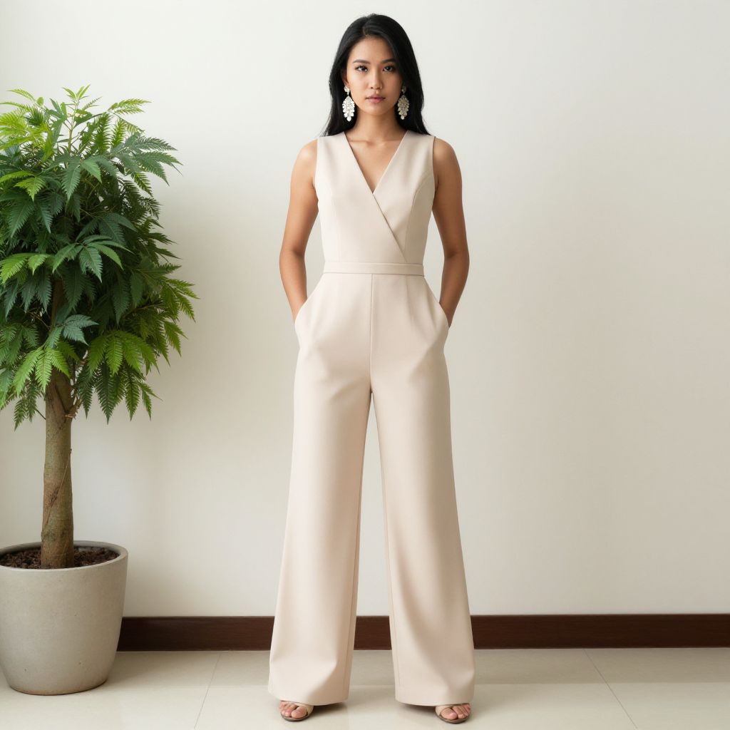 Photograph of an Asian woman with long black hair, wearing a sleeveless, V-neck, beige jumpsuit with hands in pockets, standing beside a