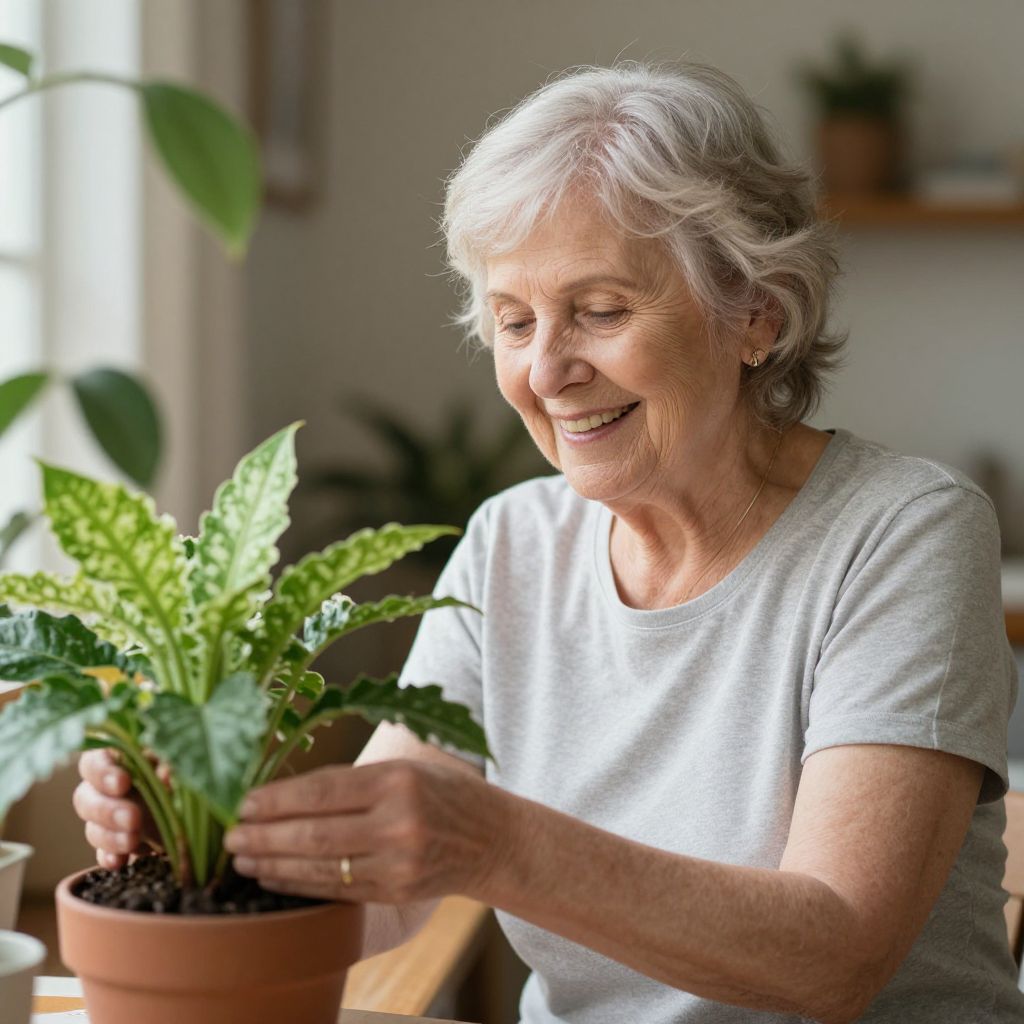 Photograph of an elderly woman with short gray hair, smiling, wearing a light gray shirt, tending to a green potted plant indoors.
