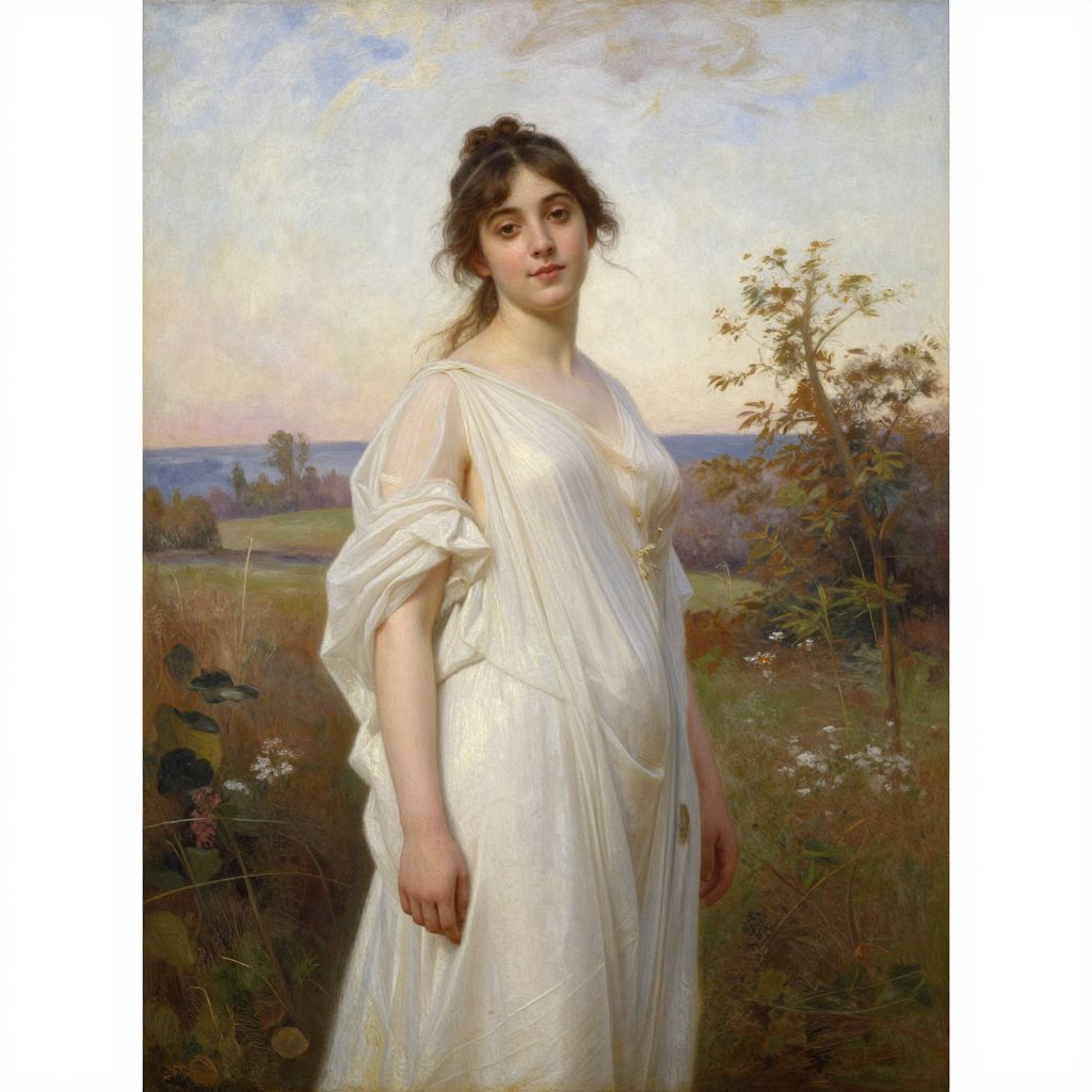 A classical oil painting by William-Adolphe Bouguereau titled \"L'Aurore,\" showcasing a serene and detailed depiction of a woman in a flowing white dress, rendered with soft, naturalistic lighting and high-definition realism characteristic of the artist's neoclassical style.