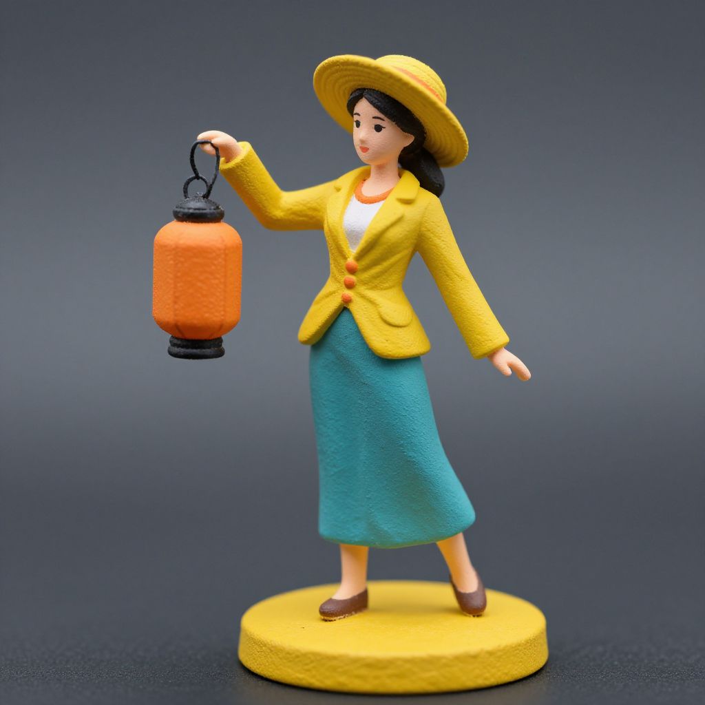 Photograph of a colorful, detailed figurine: Asian woman in yellow hat, yellow blazer, blue skirt, holding orange lantern, standing on yellow