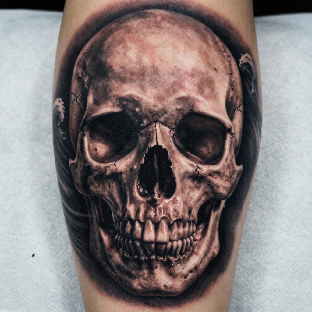 Realistic skull tattoo design emphasizing lifelike textures and shadows, including detailed cracks, eye sockets, with a backdrop of dark waves and subtle abstract elements.