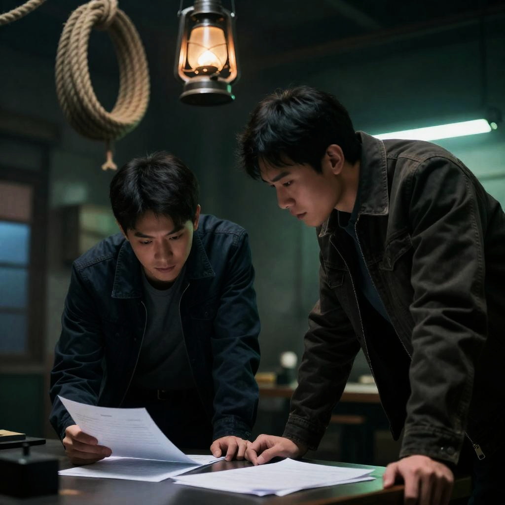 Two men in dark jackets lean over a table in a dimly lit, industrial room with green and blue lighting. One man looks intently at papers, while the other bends closely, focusing on the table. Coiled ropes and lanterns hang overhead.