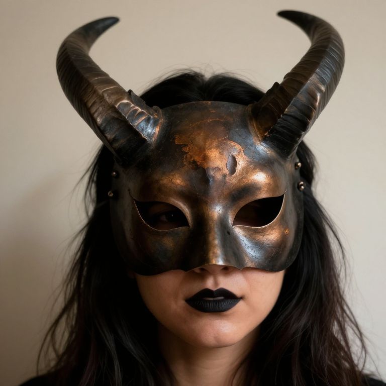 "Tiana Halloween, a close up of a person wearing a mask with horns"