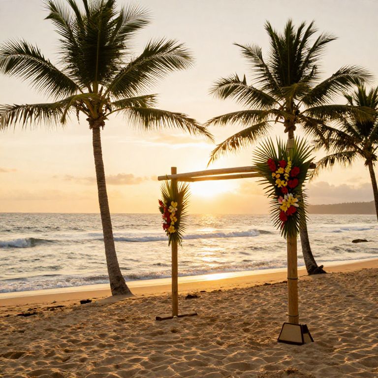 Background wedding pictures set on a golden sandy beach at sunset with gentle waves, silhouetted palm trees swaying, and a simple bamboo altar decorated with vibrant tropical flowers, evoking a peaceful and romantic seaside wedding ambiance.