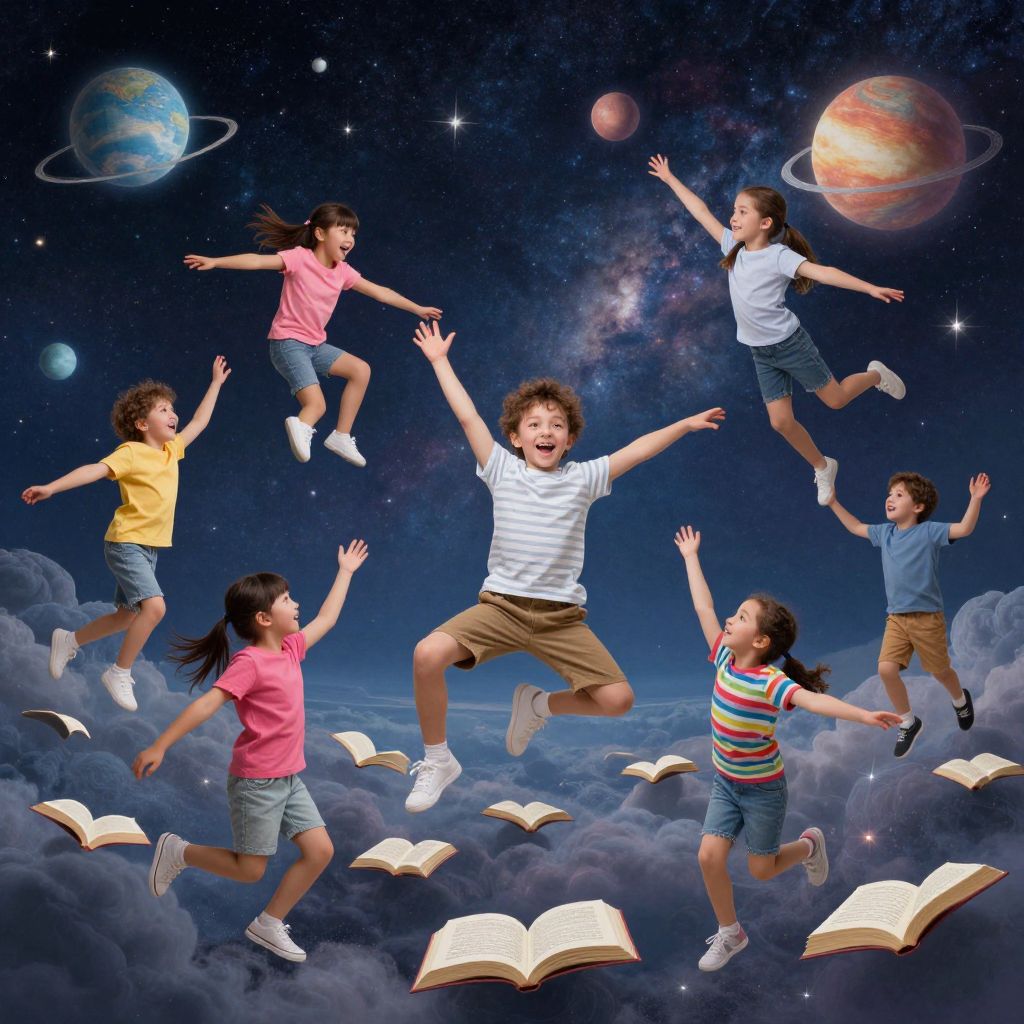 Photograph-style digital illustration of six children, three boys and three girls, joyfully jumping in mid-air against a starry, galaxy-filled background. They wear casual clothes in bright colors—shirts in pink, yellow, white, and striped, shorts in blue and khaki. Floating above a cloud-covered sky, numerous open books surround them. In the background, two colorful planets with rings are visible. The children's expressions are excited and carefree, arms raised in celebration. The image conveys a sense of imagination and wonder, blending elements of fantasy and education.