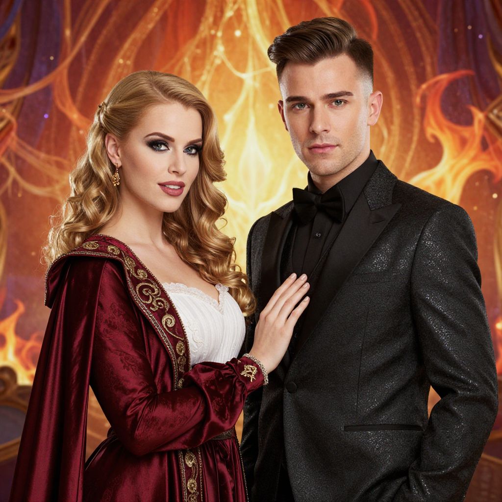 A beautiful woman in magician's clothes stands next to a handsome young man with a smooth-shaven face, set against a vibrant, magical background with fiery elements and a glossy effect.