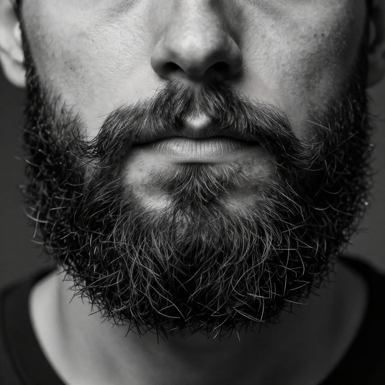 Beard style without mustache, a creative and bold grooming choice with a dense beard along the cheeks and chin, smooth upper lip, monochrome background, sharp focus on hair strands, cinematic lighting, male portrait, hyper-realistic