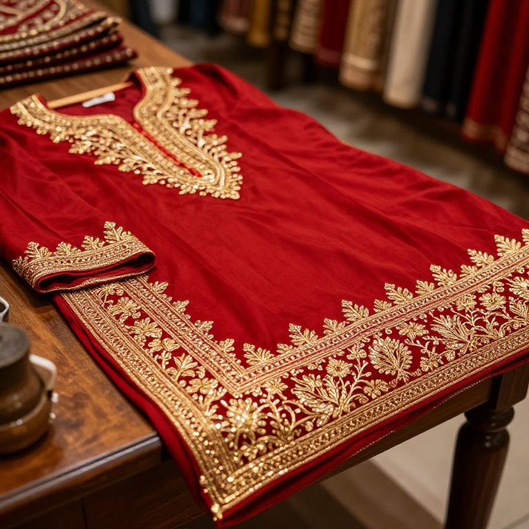 A detailed close-up of a hand-embroidered punjabi suit in crimson and gold, showcasing intricate zari work and traditional border designs, displayed on a wooden table in a heritage textile shop in Lahore, soft natural lighting and vintage ambiance.