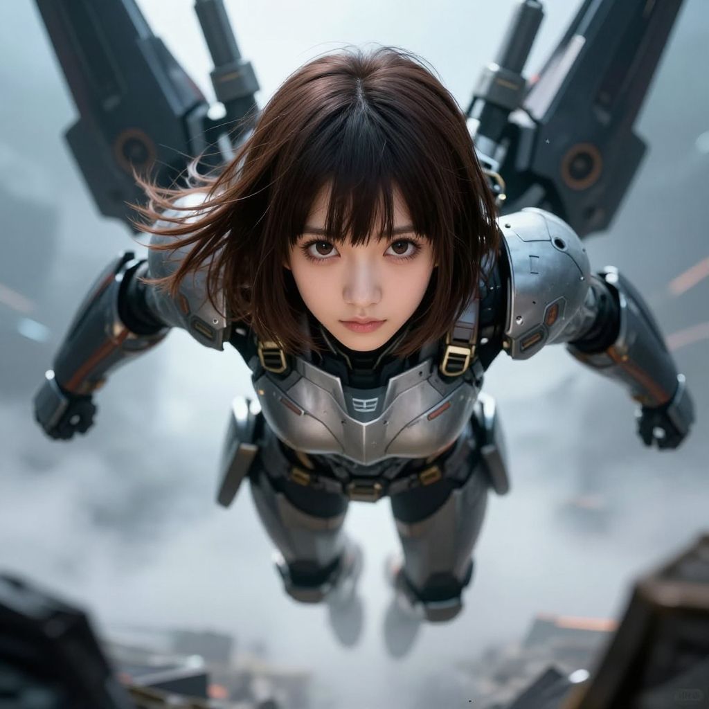 1girl, ultra realistic, super high resolutions, best quality, masterpiece, depth of field, realistic, photo-realistic, cinematic, young and beautiful japanese female, (((wearing helmets)))+++, 1mecha, perfect face, fit, graceful, finely detailed beautiful face, vibrant, kind, wise, (short brown bob hair in the air:1.38), brilliant, artistic color palette, color grading, Extremely detailed, dynamic lighting, sharp, (long legs:1.34), (50mm lens wide shots:1.36), (front angle shots:1.38), (complex, Machine background, spaceship outdoors background, Mecha Transport parts:1.38), (dark and foggy environment:1.38), ((heavy fog environment:1.38)), (battlefield behind:1.38), perfect body figure, ultra big light brown eyes, big beautiful eyes, detailed eyes, detailed face, light makeup, seductive look, (front facing viewer:1.38), w, detailmaster2, emb3r4rmor, head gear, arm armor, leg armor, mecha, SF2CL, Uniform, Mecha warrior, jump, Mecha