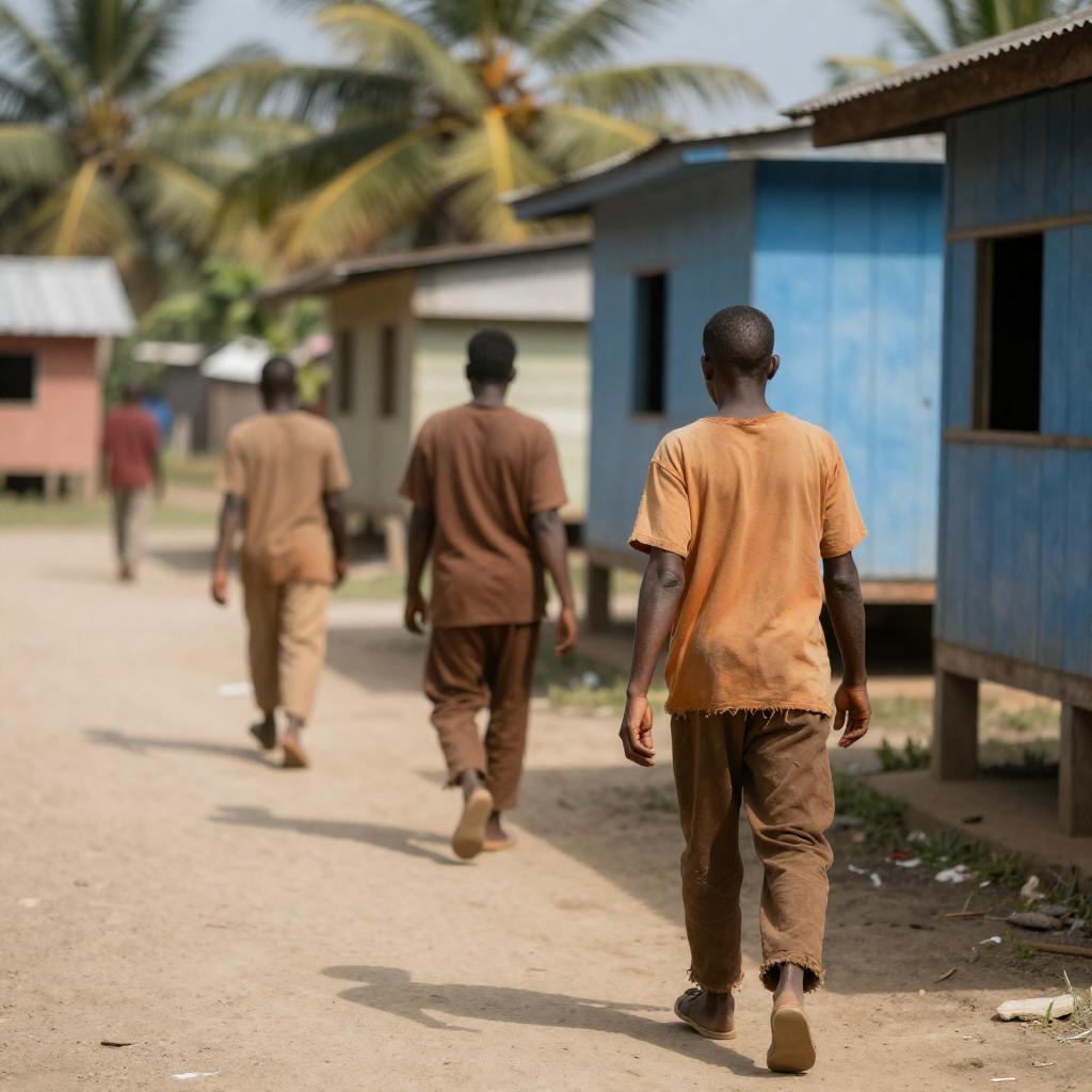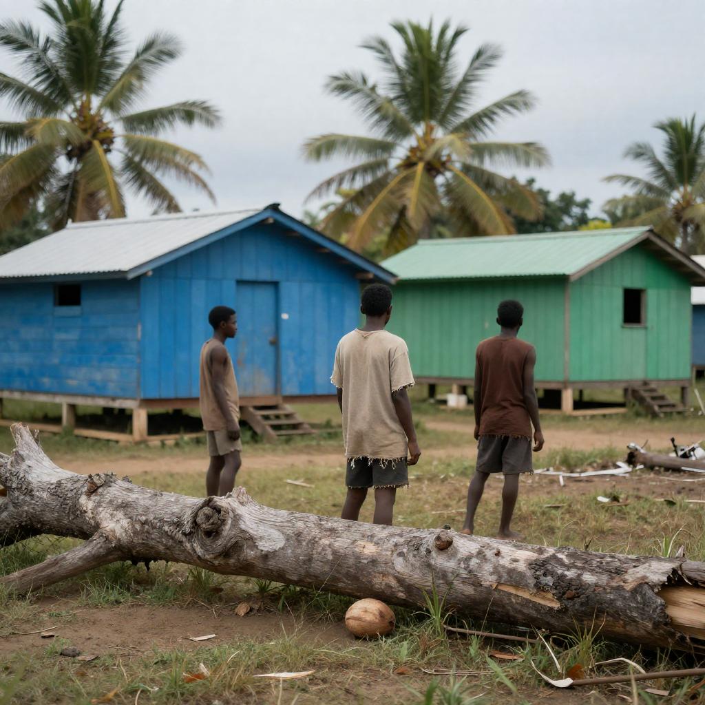 Photograph of a rural village. Three people, two standing, one facing away, wearing tattered clothes. Blue and green wooden huts, palm trees in background. Fallen tree trunk in foreground, coconut on ground. Overcast sky. Casual, worn appearance.