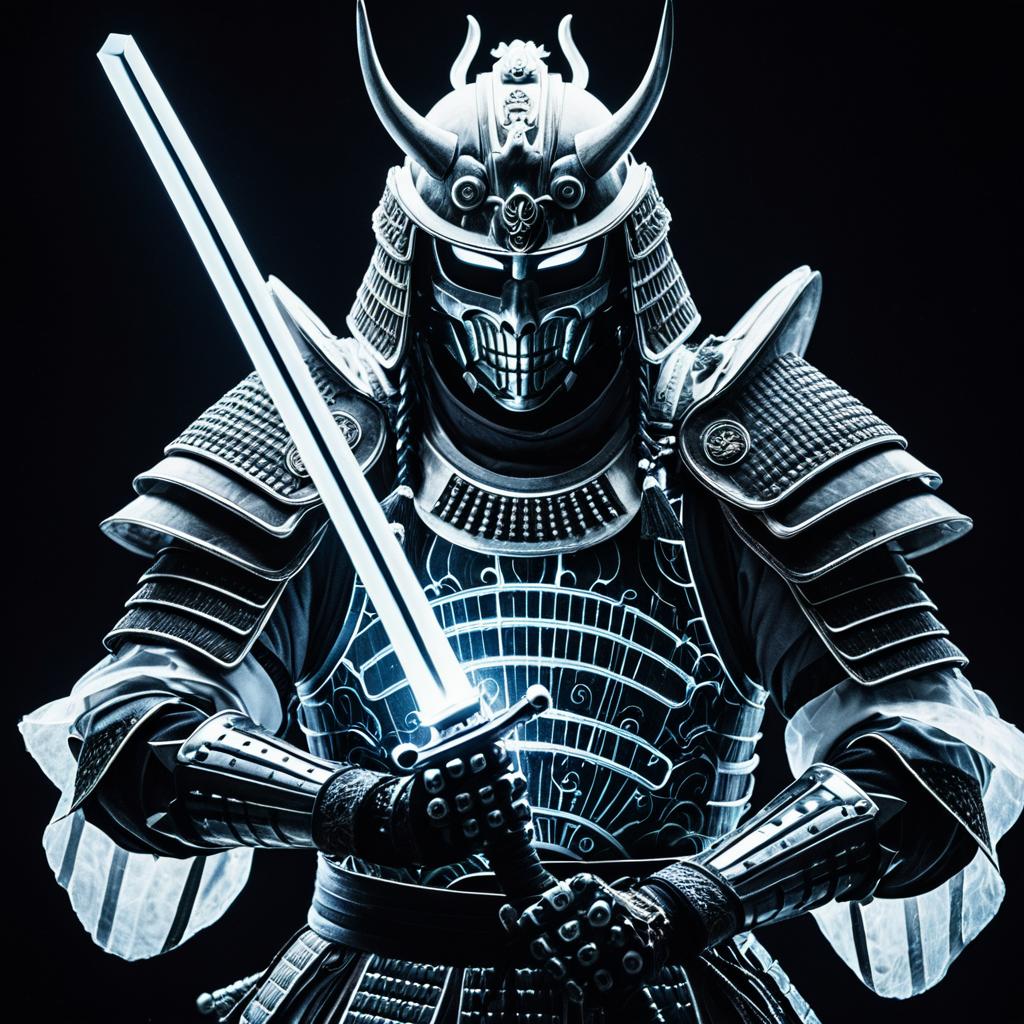 X-Ray artwork of a ghostly samurai armor, glowing joint segments and intricate inner patterns, surreal and otherworldly with translucent and radiant effects
