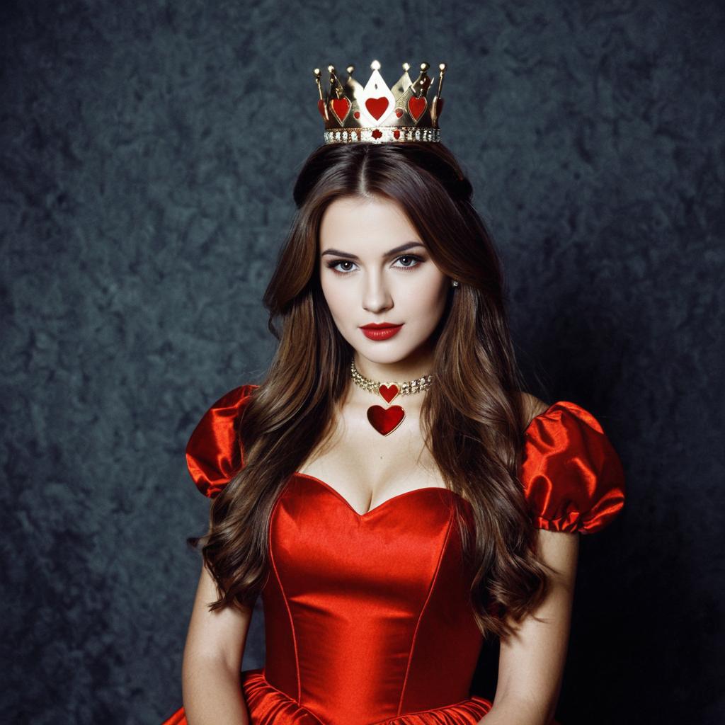 Portrait of a young woman with brown hair styled in an updo, wearing a vibrant red dress with puffed sleeves and matching red gloves. She accessorizes with a sparkling silver tiara, a statement necklace, and dangling earrings, set against a blurred background featuring candlelight.