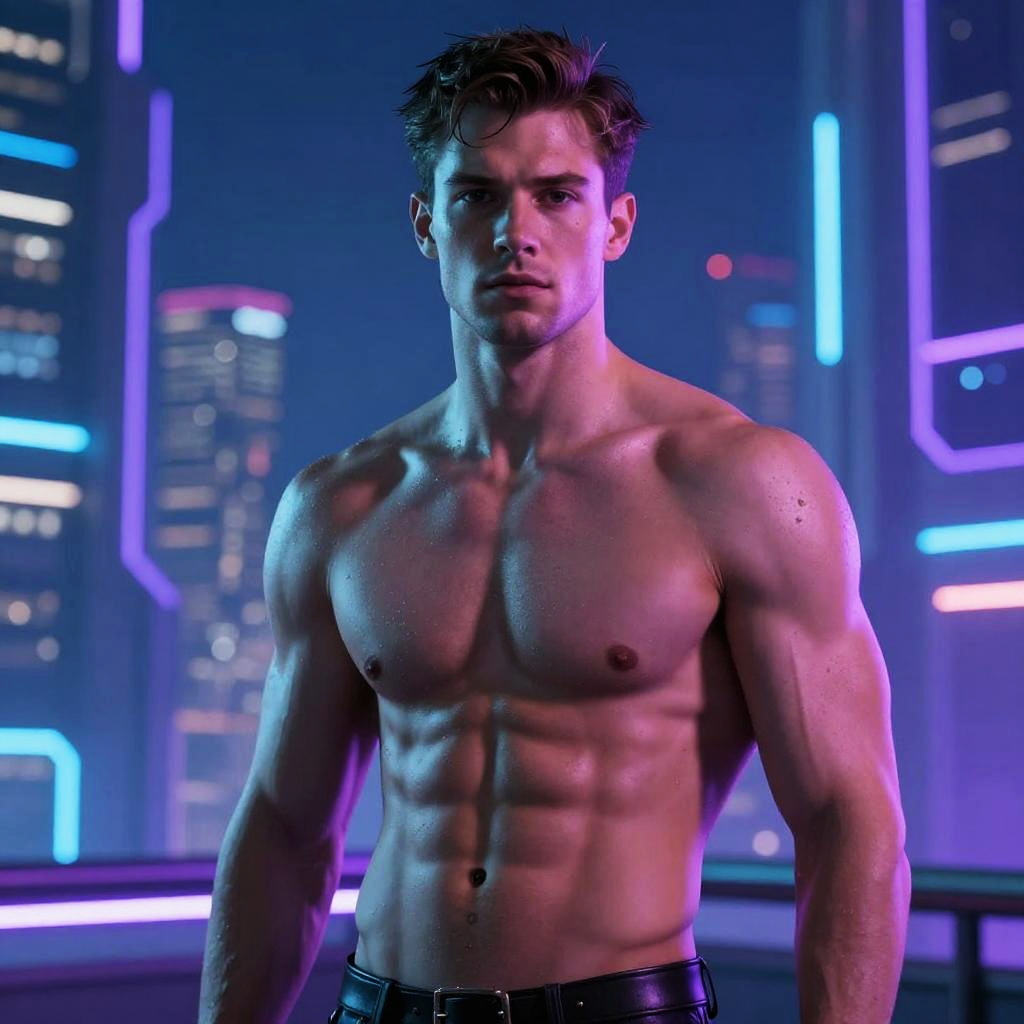 Justin Watson shirtless, futuristic sci-fi setting, neon blue and purple lights illuminating muscular physique, cyberpunk cityscape background, vibrant and detailed