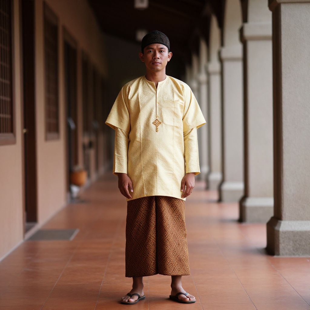 Photograph of a Southeast Asian man in a yellow long-sleeve shirt, brown patterned skirt, black headscarf, and sandals, standing