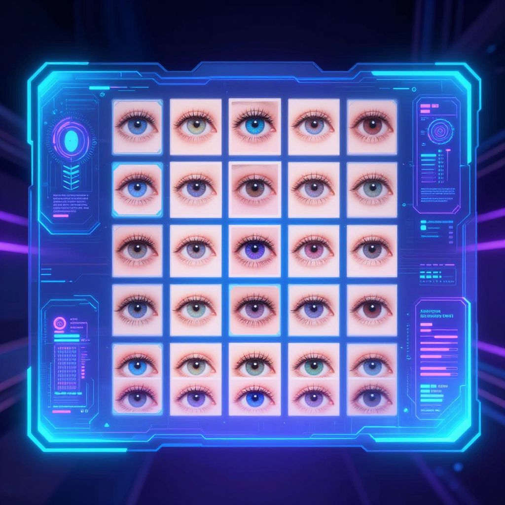 Graphic depiction of an eye color filter online tool with a grid of eye thumbnails showcasing different eye colors, futuristic holographic interface, glowing UI panels, cyberpunk aesthetic with neon blues and purples, intricate digital artistry.