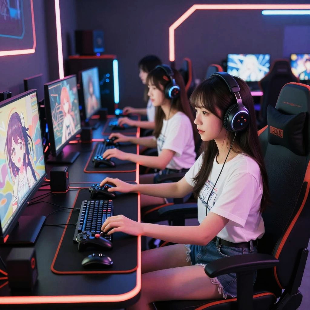 Anime gamer girls sitting at a high-tech gaming setup, surrounded by glowing monitors and game controllers, wearing stylish casual outfits, bright anime-style art with energetic vibe