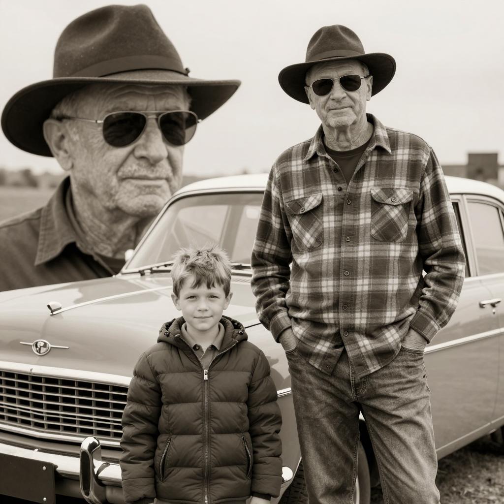 Photograph of two men fishing in a small boat. The older man with long brown hair, wearing a black cap, sunglasses, leather jacket, and green pants, holds a fishing rod with a red handle. The younger boy with blonde hair, wearing a blue plaid shirt and dark t-shirt, also holds a red-handled fishing rod. Background includes a calm river with lush green trees and another person in a distant boat. Both men have focused expressions.