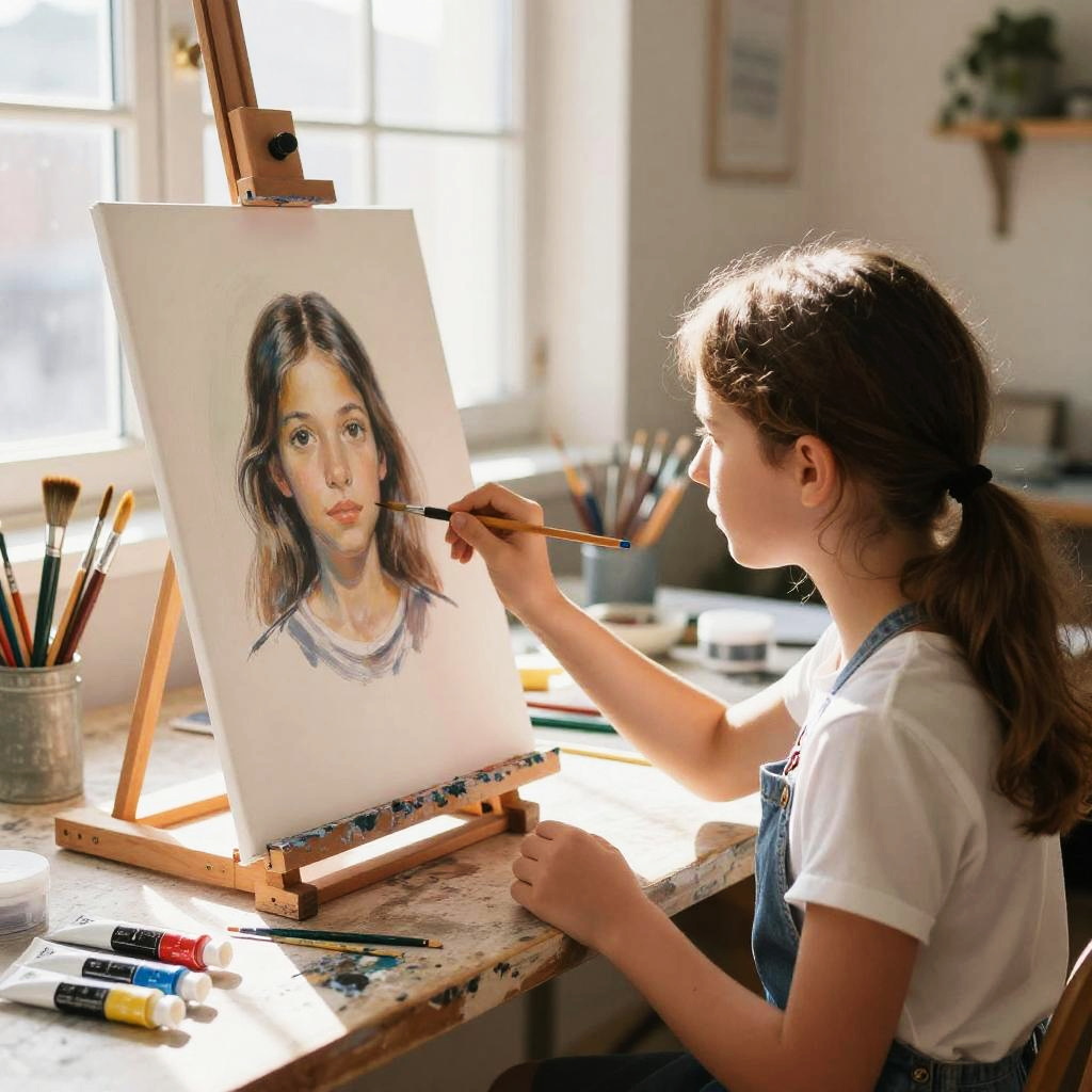12 year old girl with brown hair painting on a canvas in an art studio, surrounded by brushes and paint tubes, sunlight streaming through windows, artistic and realistic rendering