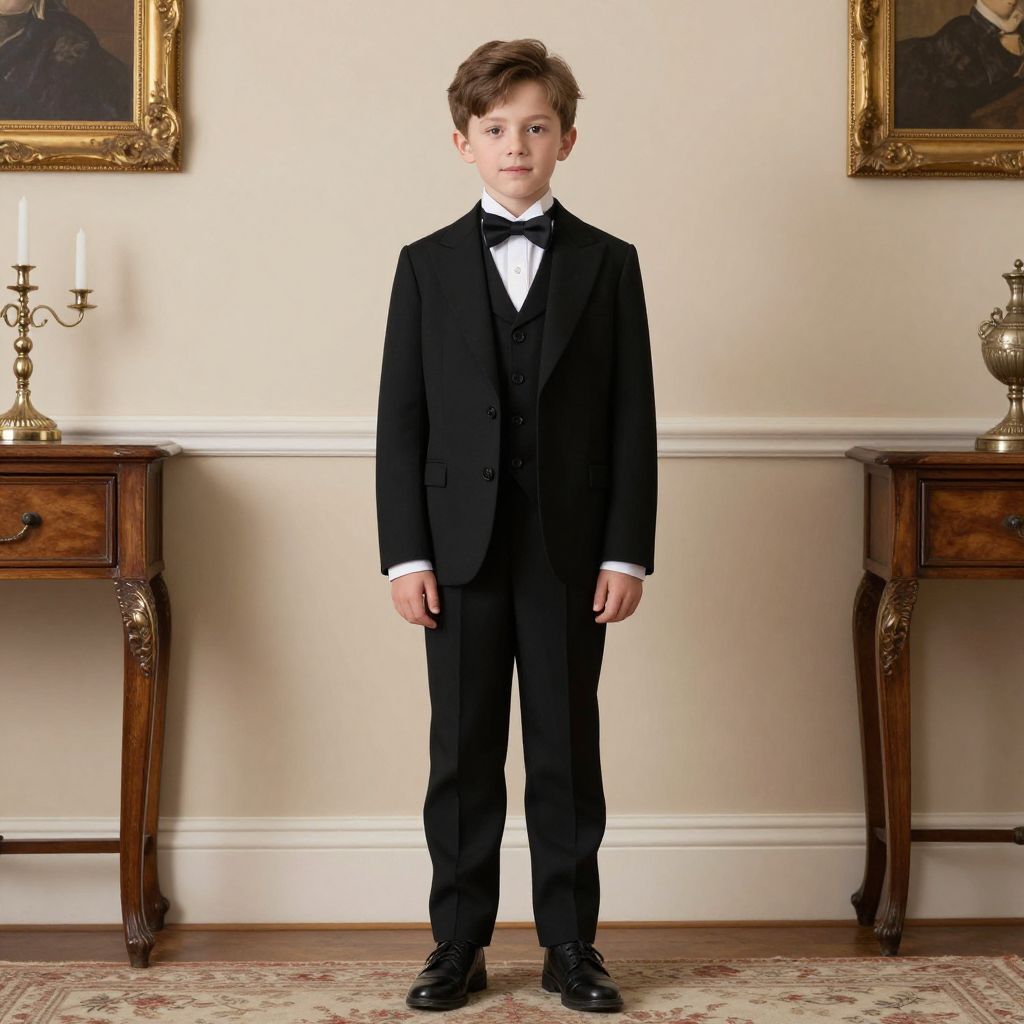 Victorian Gentleman Outfit, boy in a suit and bow tie standing in a room