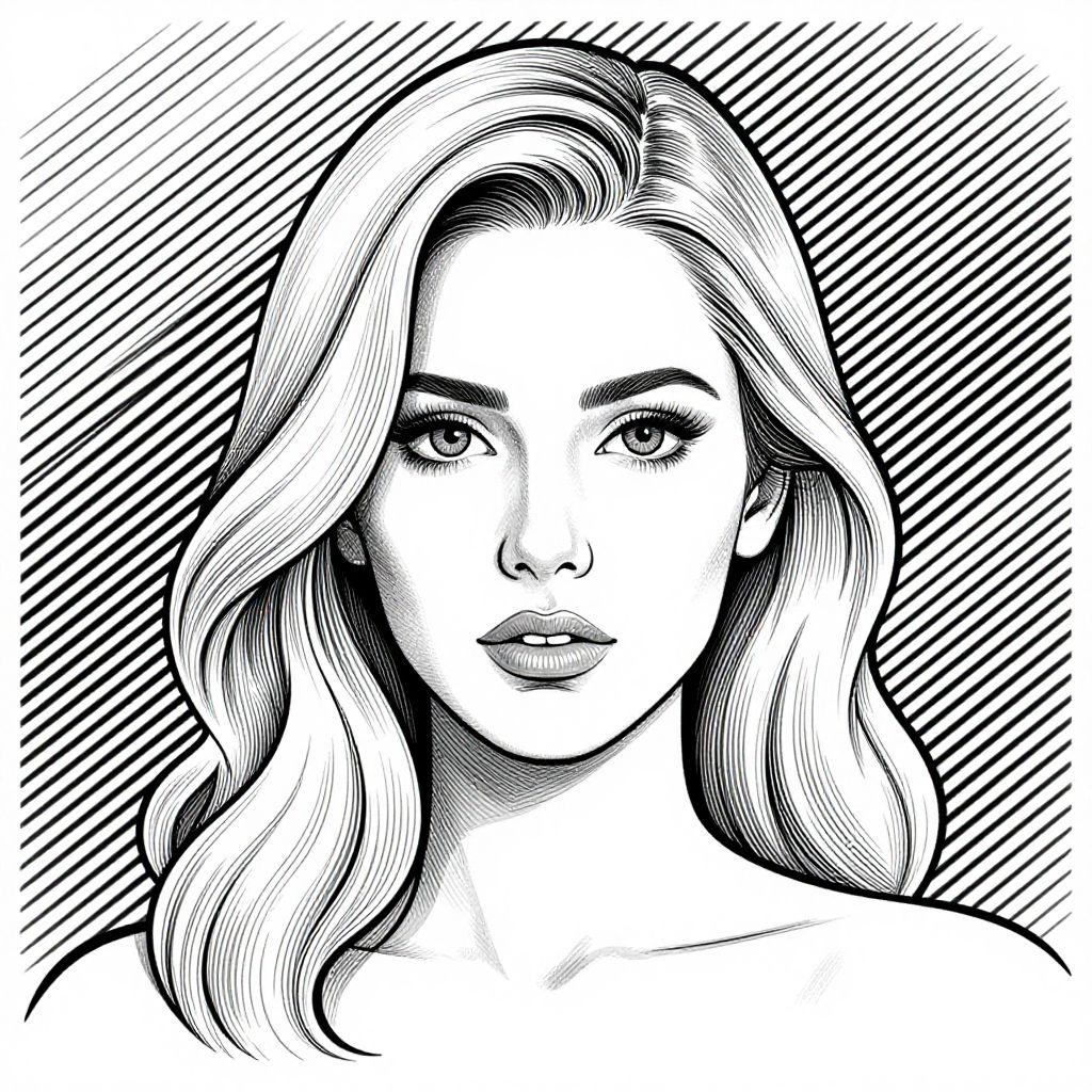 The image is a linear vector illustration of a woman's portrait. Her blonde hair, parted in the middle, cascades down her shoulders, with soft, flowing waves that add a sense of movement to the composition. The woman's face is centrally positioned, with a neutral expression that exudes a sense of calm and poise. Her eyes are large and expressive, gazing directly at the viewer, creating a strong connection. The background features a series of diagonal lines, adding depth and texture to the image. The overall color palette is monochromatic, with shades of black, white, and gray, which enhances the contrast and highlights the details of the woman's features and hair. The illustration is meticulously detailed, with precise lines and shading that give the image a three-dimensional feel. The composition is balanced, with the woman's face and hair occupying the central and upper portions of the image, while the background lines provide a structured yet dynamic backdrop.