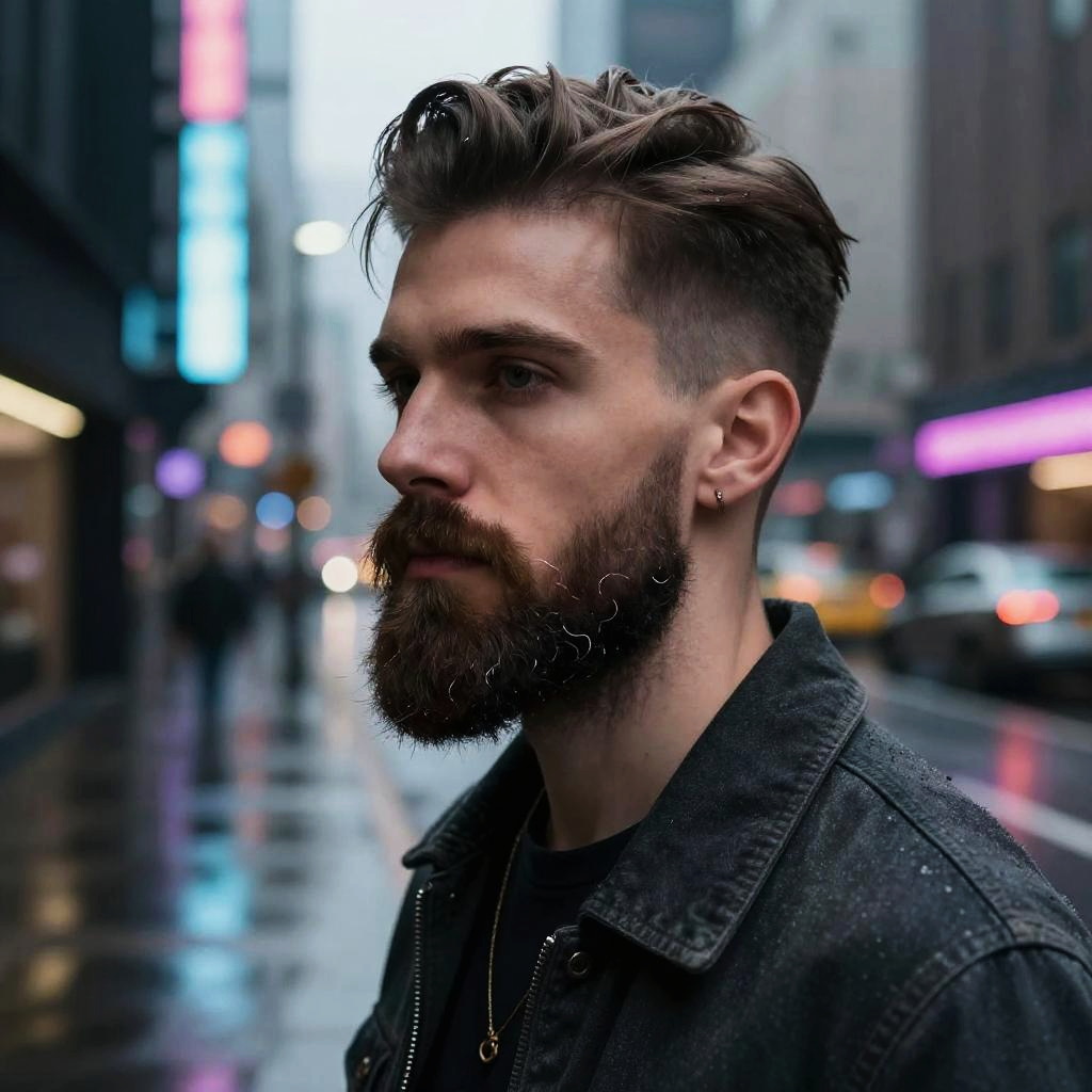 Urban portrait featuring a trendy kinnbart beard, stylish man with modern haircut, detailed chin beard sharply outlined, neon city lights reflecting in wet streets, moody and artistic atmosphere with futuristic elements