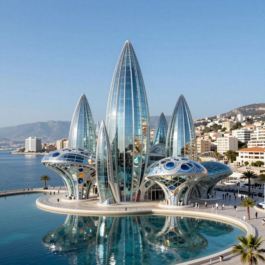 Contemporary futuristic art center known as Magic Mushroom featuring glittering glass and porcelain structures resembling wind-filled sails. Located on the waterfront of a Mediterranean downtown area, the buildings reflect perfectly in the surrounding water pools under a clear blue sky.