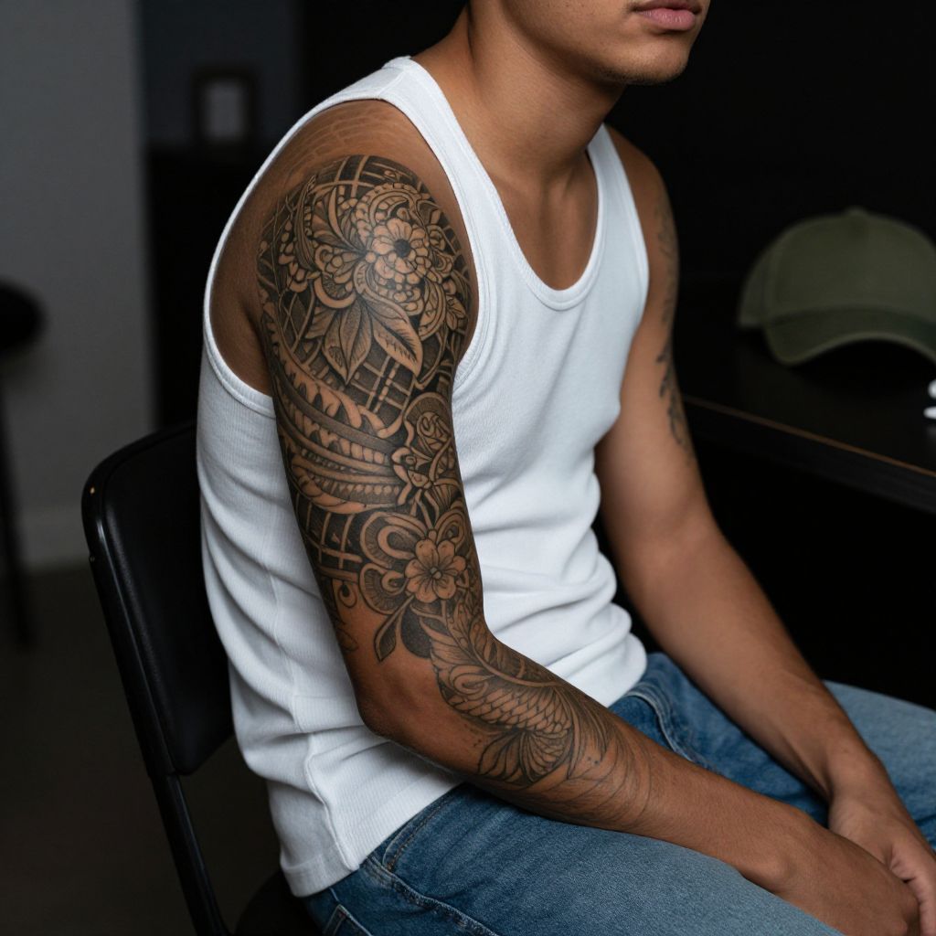 Photograph of a man with medium brown skin, wearing a white tank top, showcasing a detailed black and brown floral tattoo on his right shoulder, sitting